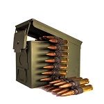 A G.I. .50 cal ammo can with 100 rounds of military surplus .50 BMG linked ammo. This is black-tip (armor piercing) ammo that is great for paper-punching or making holes in a passing Sherman tank.... A bargain at this price with no shipping costs to pay.