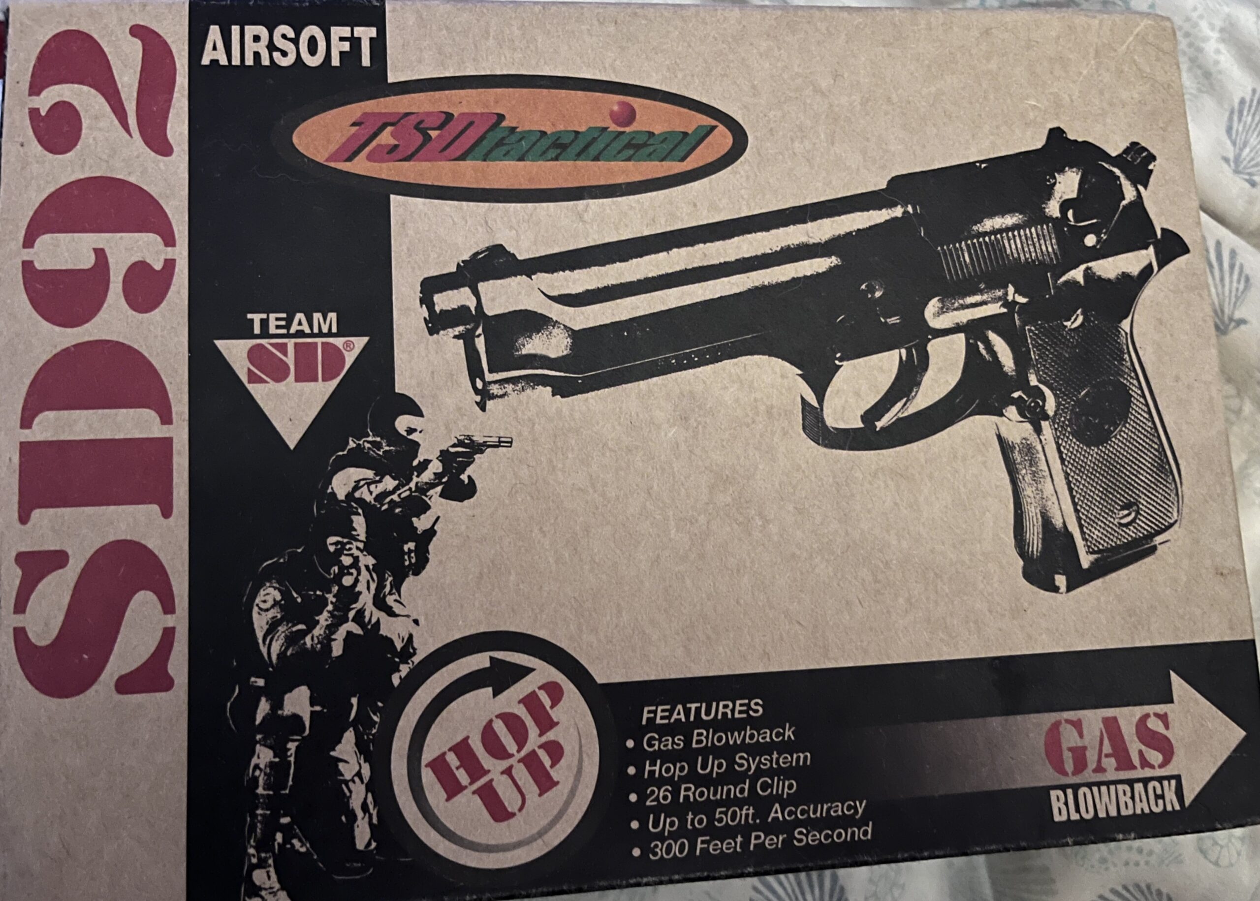 Very realistic-looking Airsoft copy of the Beretta 92. Uses "Green gas" for realistic function. Slide operates like an actual pistol when it fires and has the "Hop up" kit for great distance. Used but excellent condition. Boxed.