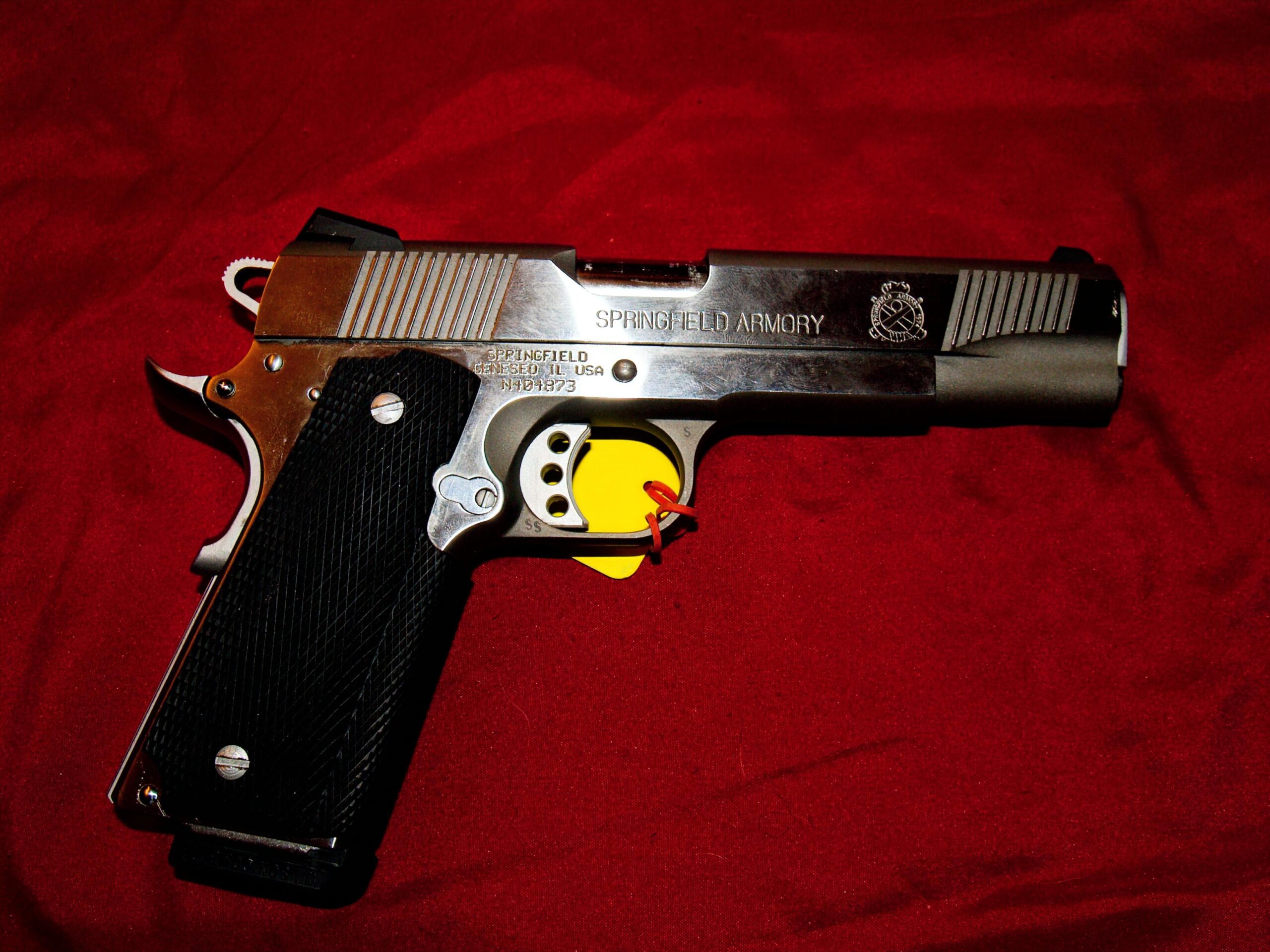 Springfield Armory 1911-A1 style pistol. Model name is the "Loaded" because it is loaded with features usually only found on custom guns. Caliber is .45 auto in beautiful Stainless steel.