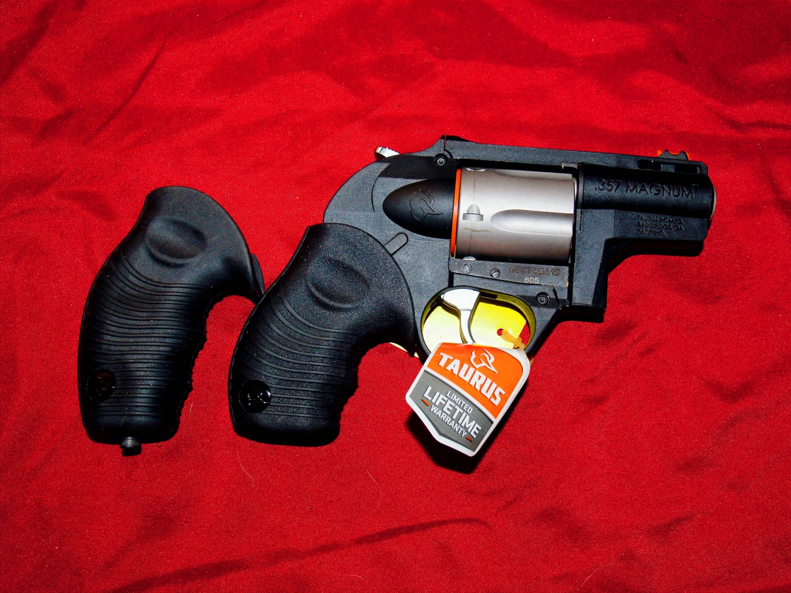 Taurus Model 605 .357 magnum revolver (can also shoot .38 Special). Two sets of grips for length choice. Hidden hammer for easy pocket draw.