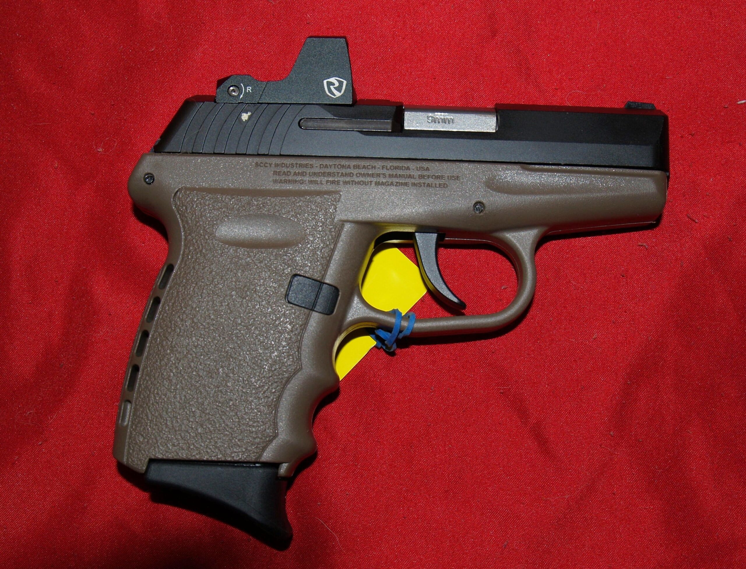 SCCY CPX-2 9mm pistol with factory installed ed Dot sight. Flat Dark Earth and black colors. 2-10 round mags.