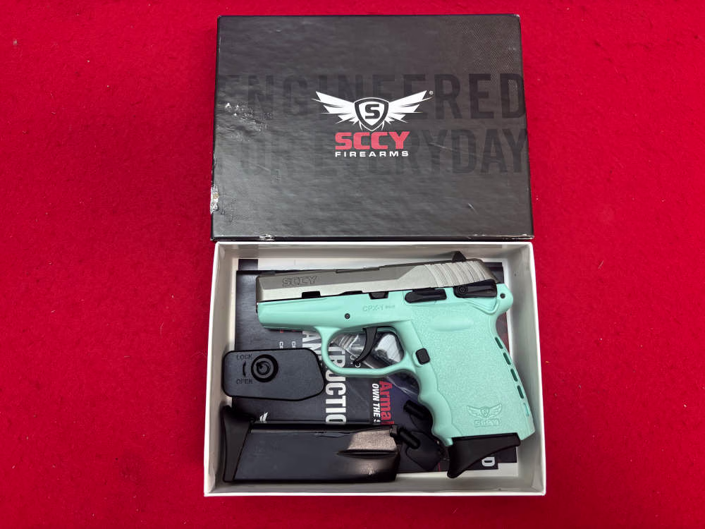 Nice Light Blue and Silver SCCY CPX-2 auto pistol. No manual safety for quick action. Two 10-round magazines, lock, and extra mag. floorplates.