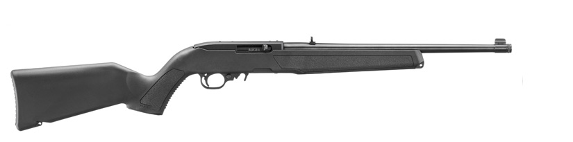 Ruger 10/22 rifle. With threaded 16" barrel for suppressor mounting. Classic 10-round rotary magazine. Black polymer stock.